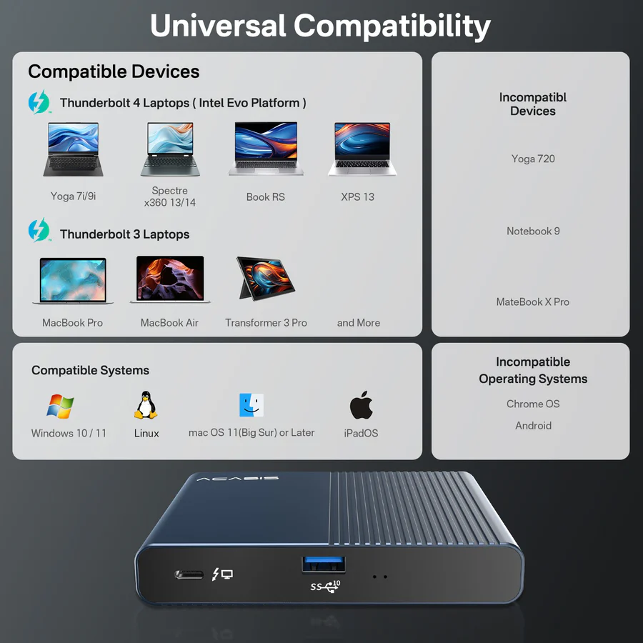 ACASIS Thunderbolt 4 hub easily expand 2 Monitors for you, Single 8K display high resolution, Ideal for high resolution displays & high speed NVME SSD storage devices.With the DS9001, you’ll be able to solve laptop expansion and external monitor problems with one Thunderbolt cable.