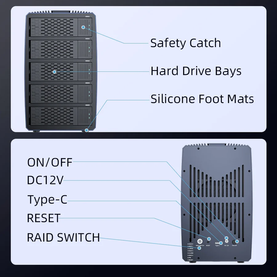 This 5 Bay RAID SATA Hard Drive Enclosure supports 2.5/3.5 inch SATA HDD/SSD.Compatible with Windows7 and above, Mac10 and above, Linux.