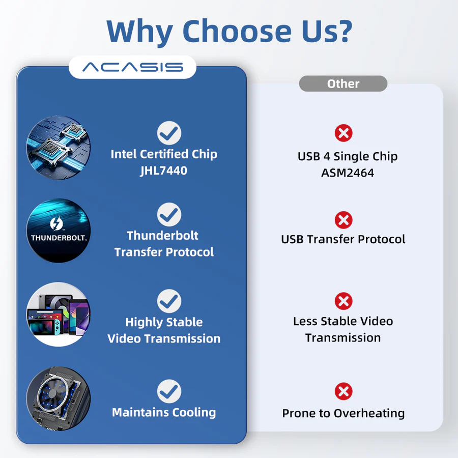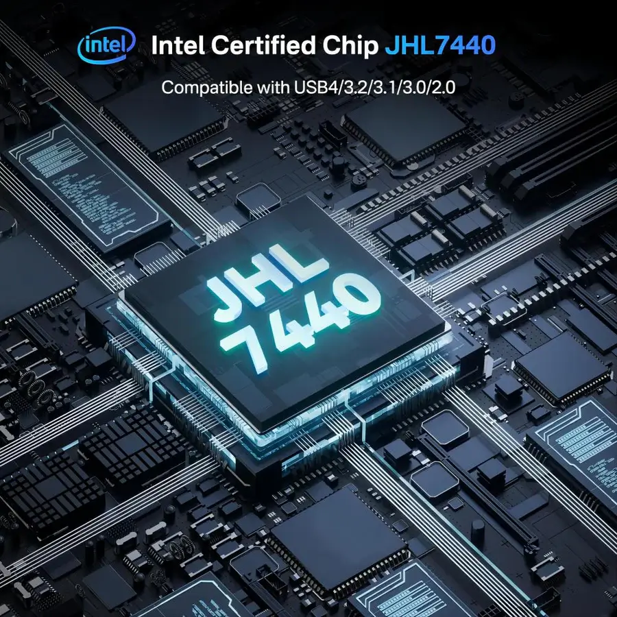 Unlike other enclosures that use the ASMedia® AMS2464 chip, ACASIS adopts a dual-chip design, ensuring backward compatibility with Thunderbolt 5/4/3 and USB4/3.2/3.1/3.0/2.0. The JHL7440 chip and the REALTEK® RTL9210B chip are perfectly combined, ensuring stable and smooth data transfer. The JHL7440 chip serves as the main controller, supporting up to 40Gbps ultra-fast transfer rates.